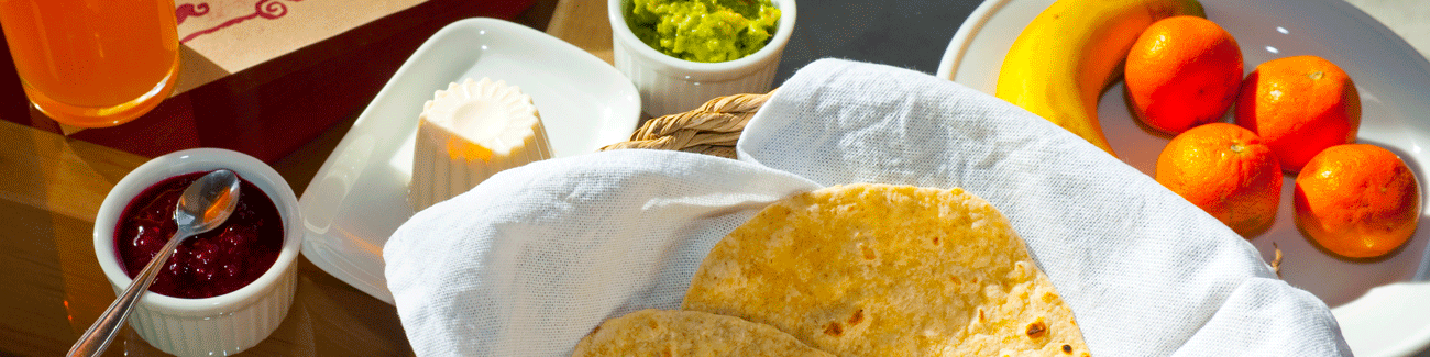 En la senda de ir honrando nuestro cuerpo, mente y espíritu, hemos escogido un desayuno nutritivo para tí, el que consta de: jugo de naranja recién exprimido, granola casera, fruta fresca, yogurt, chapatis (tortillas integrales sin polvos de hornear ni levadura, una especie de pan sano), quesillo, palta, mermelada de frambuesa casera, té en hojas, rooibos y café orgánico. Contamos con pan de masa madre.